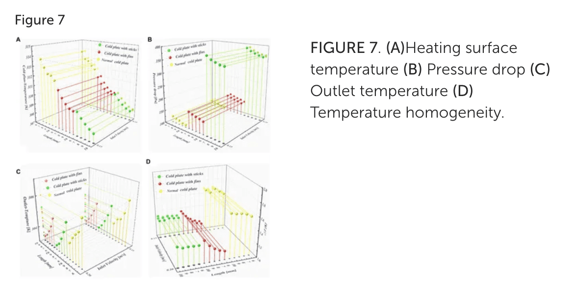 Cold plate performance enhancement based on parametric modeling of multiple structures. Figure 7 compares temperature, pressure drop, outlet temperature and temperature uniformity across three cold plate designs. The results show that geometry has a major impact on performance. Source: https://www.frontiersin.org/journals/energy-research/articles/10.3389/fenrg.2022.1087682/full