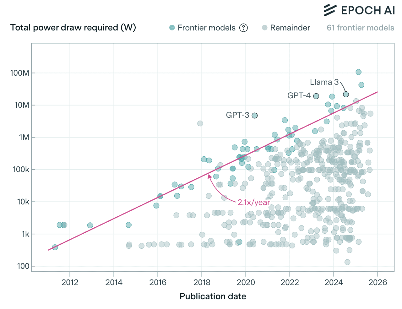 The power required to train frontier AI models is doubling annually. Source: https://epoch.ai/data-insights/power-usage-trend