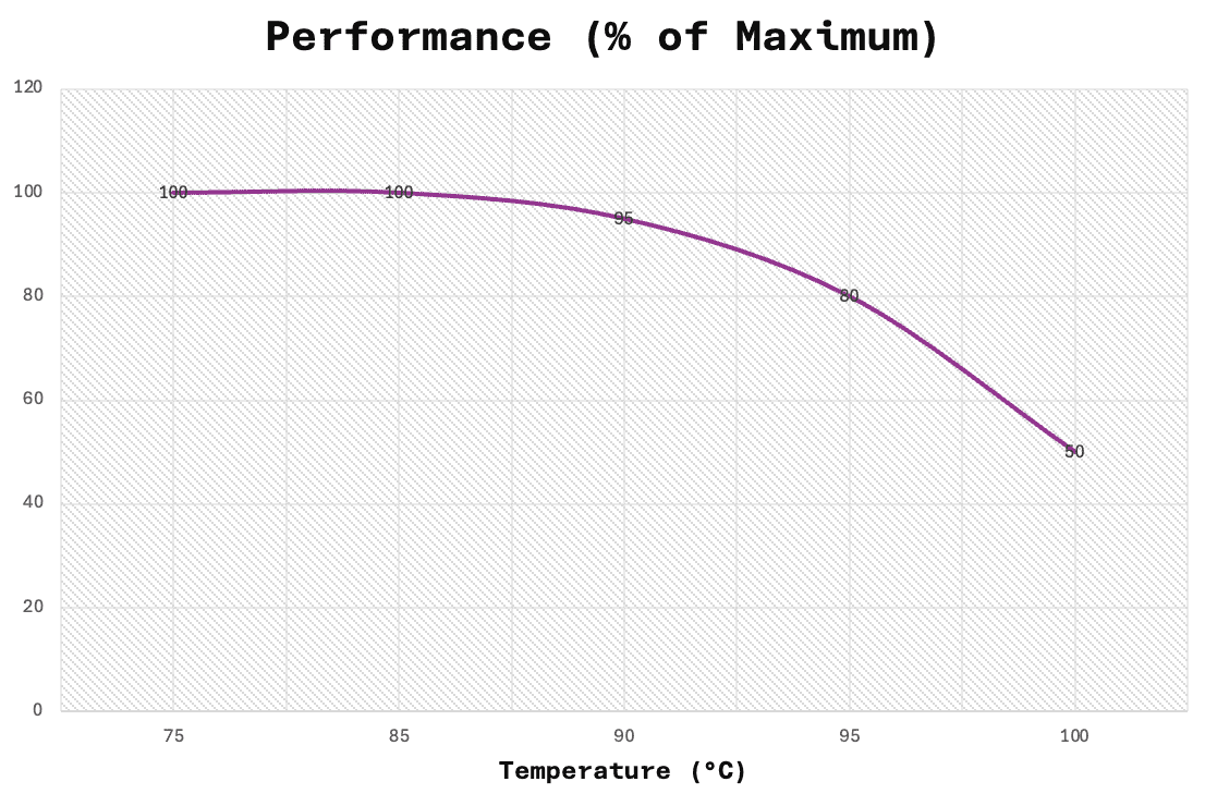 Up to 85°C, GPU performance typically remains at maximum unless continuously stressed.​ Between 90–95°C, thermal throttling begins, resulting in clock speed reductions and gradual performance loss (≈5–20%).​ Above 95°C, drop-off becomes much more pronounced; severe cases (near 100°C) can reduce performance by up to 50% and sharply increase risk of hardware failure.​ Source: Based on industry data (ServerMania’s 2025 GPU temperature guide), showing GPU performance degradation as junction temperature increases, structured according to observed failure/throttle thresholds widely cited across a variety of high-performance computing operations.
